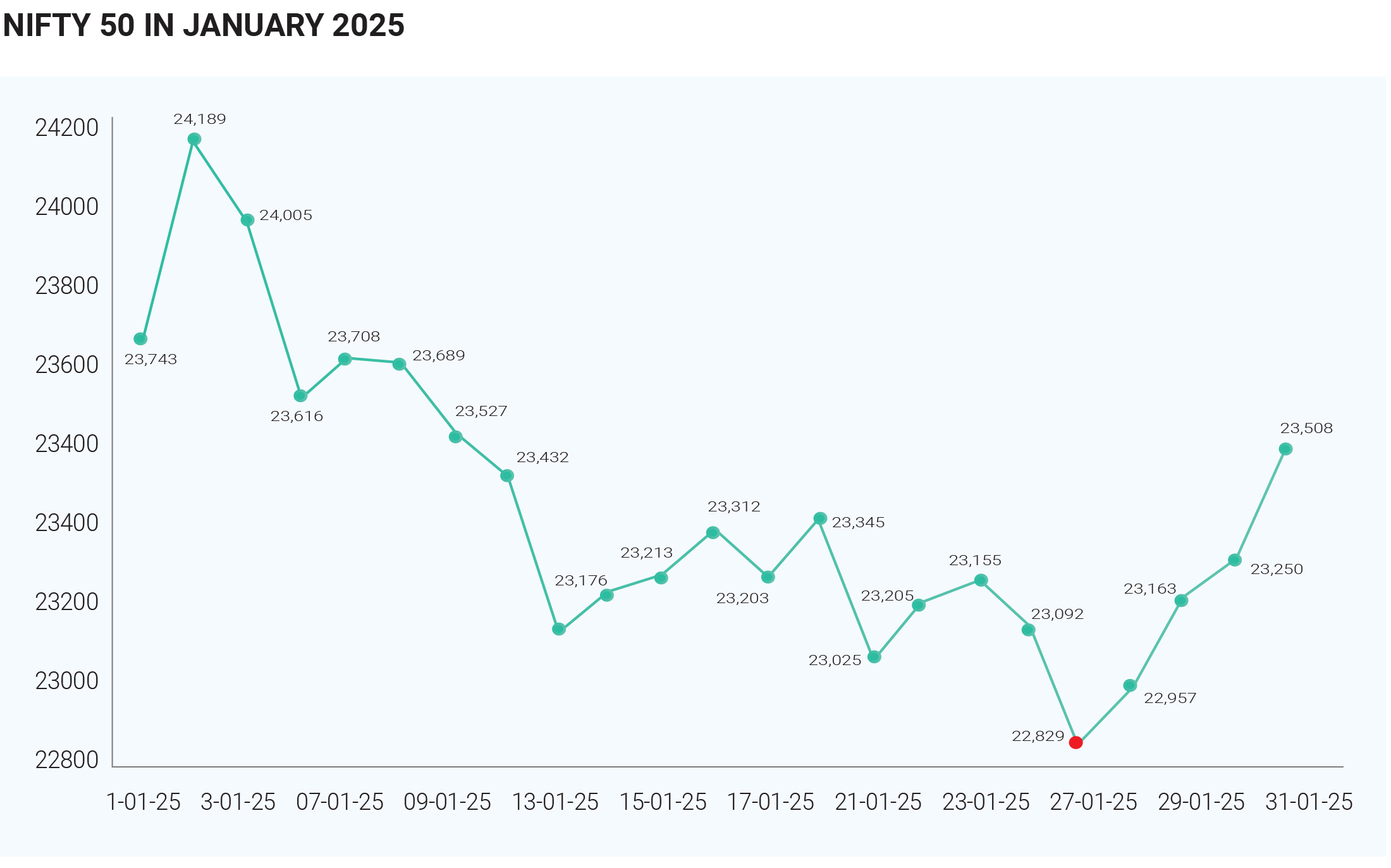 The Indian market's decline mirrored broader trends in global equities. Poor performance in Asian markets, particularly a 2.56% drop in Japan’s Nikkei, highlighted growing fears of an economic slowdown. Weak global factory activity further fuelled concerns, contributing to market declines across India. On the domestic front, inflation emerged as a major rate-cut cycle by the RBI in early 2025, contingent on inflation data. A reduction of 50 basis points over two policy announcements was under consideration, although any decision would be highly dependent on the inflation trajectory and broader economic conditions. The last week of January saw a glimmer of hope as equity markets began to recover. The sentiment was boosted by the RBI’s announcement of several measures to inject over ₹1 lakh crore of liquidity into the banking system. This move raised expectations of monetary policy easing in the RBI’s February 2025 meeting. Additionally, encouraging earnings updates from prominent U.S. tech companies helped offset fears stemming from renewed tariff threats by the U.S. President and concerns over China’s advancements in artificial intelligence, particularly following the launch of Deepseek. The challenges faced in January 2025 underscore the complex environment for Indian stock markets, shaped by global economic policies, significant FII sell-offs, and domestic economic concerns. As February unfolds, continued volatility is anticipated, driven by global economic conditions and local political events. While there may be opportunities for stock-specific gains, investors are advised to remain vigilant and prepared for market fluctuations as both domestic and international developments continue to influence sentiment.