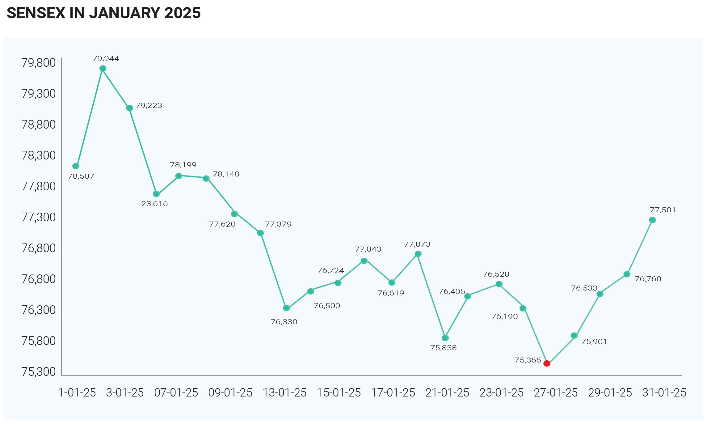 January 2025 proved to be one of the most challenging months for the Indian stock markets in over two decades, as both the Sensex and Nifty indices faced significant downturns. The Sensex declined by around 2%, opening at approximately 78,507 points and closing the month at