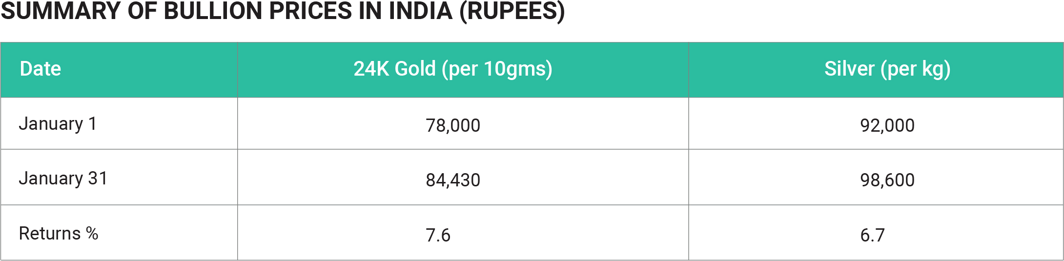 In January 2025, the bullion markets in India, which include gold and silver, experienced fluctuations influenced by various economic factors. Overall, both gold and silver showed positive returns in January 2025, with gold prices increasing by approximately 7.7% and silver by about 6.9%. Geopolitical tensions and economic instability in January 2025 drove investors toward safe-haven assets like gold and silver, boosting their prices. Heightened uncertainty of the Indian rupee against the U.S. dollar contributed to higher local prices for imported commodities, including bullion. Domestic factors also played a pivotal role in supporting bullion prices. The festive season and ongoing wedding demand in India sustained buying interest, further propping up market prices throughout the month. Looking ahead, February 2025 is expected to be dynamic in global markets fueled increased demand for these precious metals. Changes in government policies, particularly regarding import duties and trade regulations, may have positively influenced market dynamics. Persistent global inflation concerns further bolstered interest in gold and silver as investors sought protection against eroding purchasing power. Precious metals are traditionally considered effective hedges during inflationary periods. Additionally, the depreciation for the Indian bullion market. Key factors such as global economic conditions, potential interest rate decisions, Trump administration trade policies, currency fluctuations, and evolving market sentiment will likely shape the trajectory of gold and silver prices. Investors are advised to closely monitor these developments as they navigate an increasingly complex investment landscape.