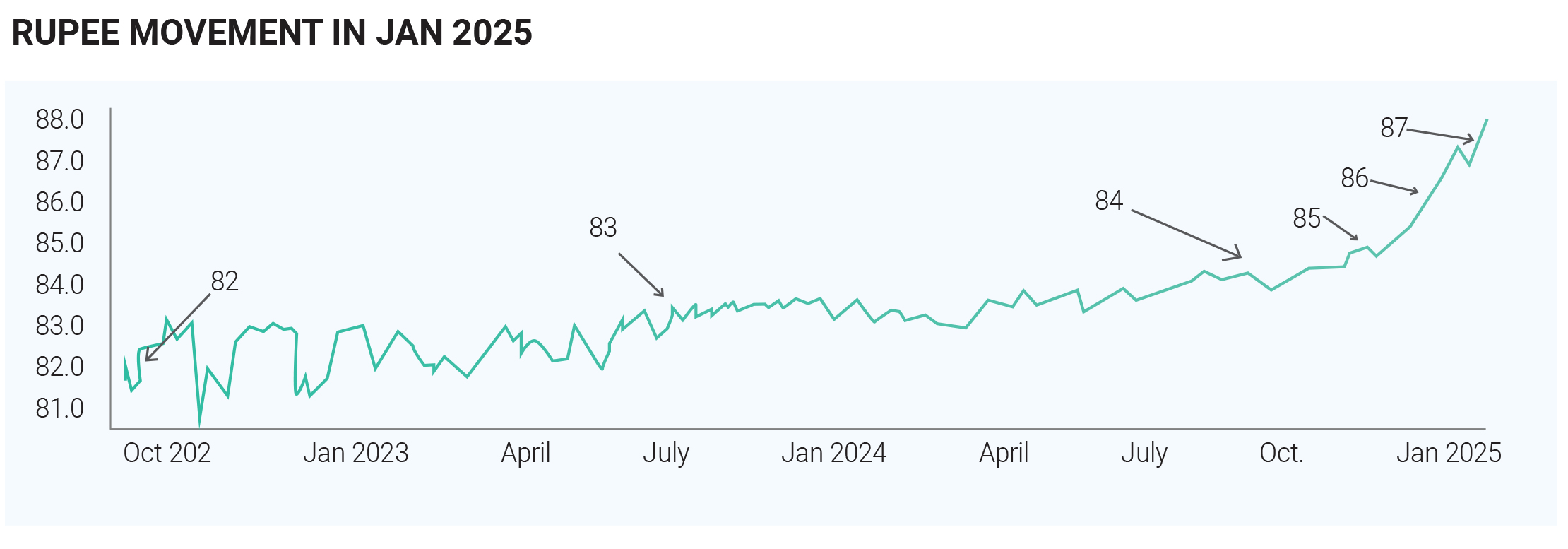 In January 2025, the Indian rupee experienced a notable depreciation against the U.S. dollar, declining from approximately ₹85.56 at the beginning of the month to around ₹86.50 by month-end. This weakening was influenced by several factors, including shifts in U.S. economic policies, key financial indicators, and interest rate decisions that bolstered the dollar's strength. Domestic challenges further exacerbated the situation. India's persistent trade deficit, particularly with China, remains a significant concern. In the fiscal year 2024, the trade deficit with China soared to $85.1 billion. Imports from China rose by 9.8% year-on-year, amounting to $65.89 billion, while exports to China dropped by 9.37%, totalling approximately $8 billion. This imbalance underscores India's reliance on Chinese imports and highlights structural vulnerabilities in its trade ecosystem. As India gears up for Budget 2025, strategic reforms aimed at reducing import dependency and strengthening domestic production are anticipated. Measures to encourage local manufacturing and enhance export competitiveness may help address these economic concerns. The rupee's depreciation was also influenced by inflationary pressures, heightened demand for dollars, trade tensions, and expectations surrounding the Reserve Bank of India's (RBI) monetary policy stance. Moving forward, interventions by the RBI and favourable domestic economic developments could contribute to stabilizing the currency in the coming months.
